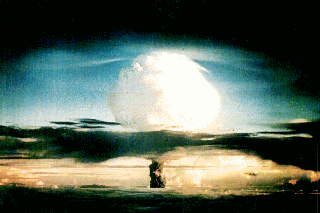 mushroom cloud appears over the crater that used to be Eluklab Island. The "dirty stem" is a result of the millions of pounds